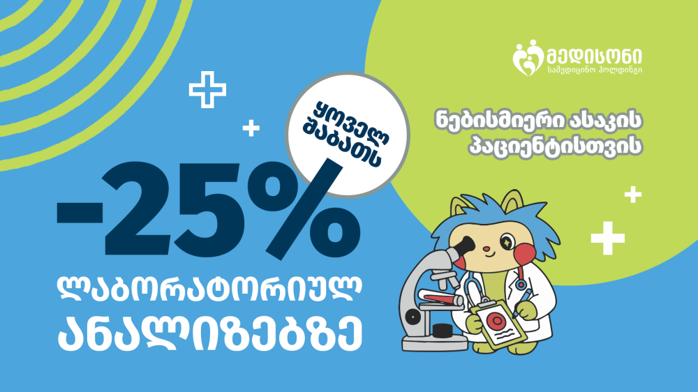 ყოველ შაბათს, ნებისმიერი ასაკის პაციენტისთვის, ყველა ლაბორატორიული კვლევა -25% ფასდაკლებით!